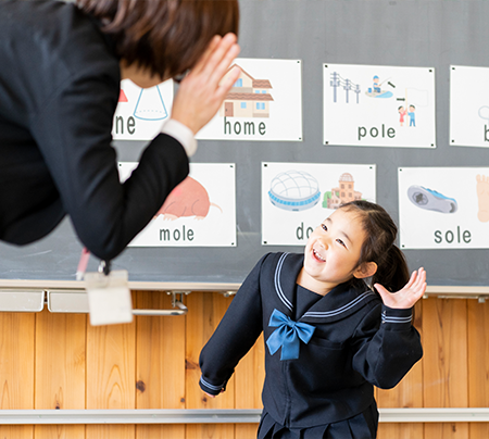 英語で進んでコミュニケーションができる子の育成を目指します。Primary(小1~4)では週に2時間、M1・2(小5・6)では週に3時間英語の授業があります。